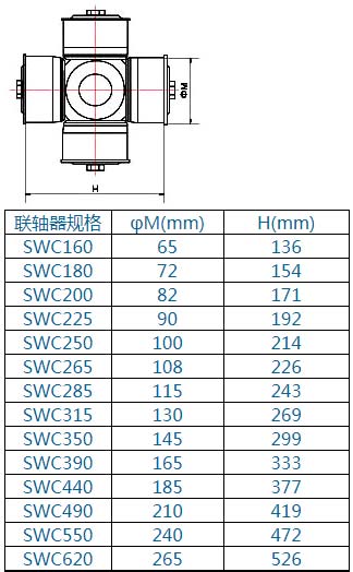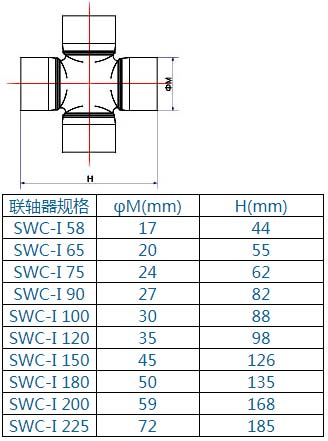 不同型號(hào)的十字軸式萬(wàn)向聯(lián)軸器,其十字軸總成的結(jié)構(gòu)型式和主要參數(shù)各不相同,常用SWC-I型輕型十字軸式萬(wàn)向聯(lián)軸器SWC型中型十字軸式萬(wàn)向聯(lián)軸器十字總成的外部結(jié)構(gòu)和主要尺寸見(jiàn)下圖以及表格。用戶可根據(jù)需要選用。