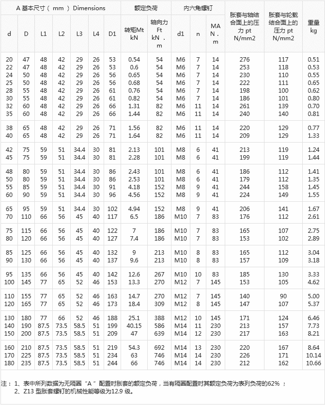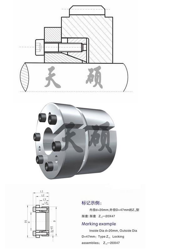 特性:Z13型脹緊套內外錐環用內六角螺栓擰緊,結合面較長,且對中性好,適用于旋轉精度要求較高和傳遞較大載荷的場合。