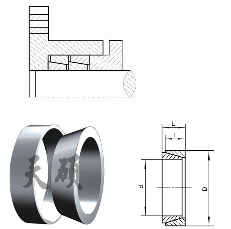 特性 :Z1型脹緊套由內外錐環組成。結構緊湊輕巧,適用于安裝空間較小的場合。可以代替各種鍵聯結或過盈配合聯結使用。為傳遞較大載荷可采用多對脹套,單側壓緊不超過4對環,雙側壓緊可達8對環,且對中性好。