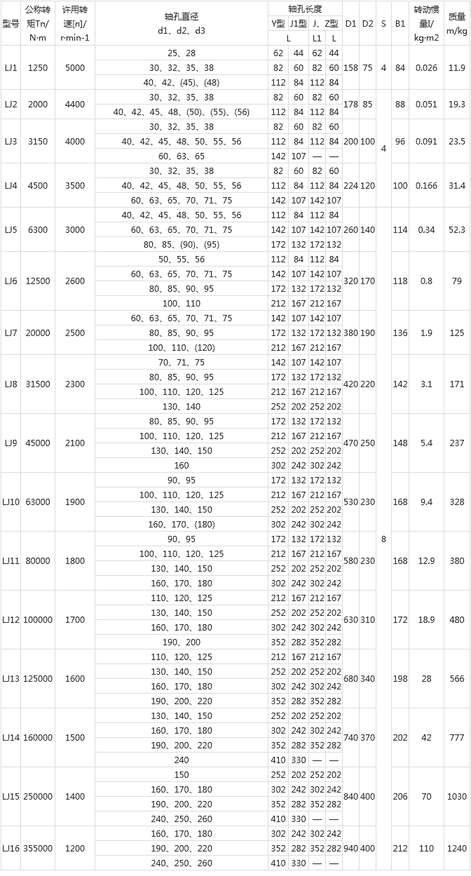 2.表中轉動慣量和質量是按聯軸器最大實體計算的近似值。